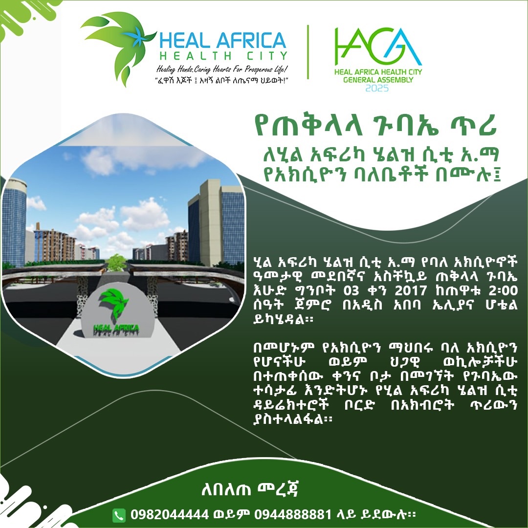 Heal Africa Health City Share Company is currently hosting an acceptance meeting for new members at the Eliana Hotel in Addis Ababa. Shareholders from Ethiopia and abroad are participating in this momentous event.